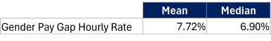 We are proud to report a reduction in the mean gender pay gap from 10.60% to 7.72%, a decrease of 2.88%. Similarly, the median gender pay gap has nearly halved from 12.10% to 6.90%, a significant improvement. Our efforts will remain constant in reducing this further.