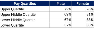 For our pay quartile data, we have ordered our employees from highest to lowest paid and created quartiles with equal numbers of employees in each. In comparison to the report from previous year, we have seen an increase in the percentage of women in the Upper Quartile and Upper Middle Quartile, up by 4% and 7%, respectively. While the percentage of women in the lowest quartile is still higher, this is largely due to factors such as flexible working arrangements. However, we are committed to achieving a more balanced gender distribution across all quartiles.